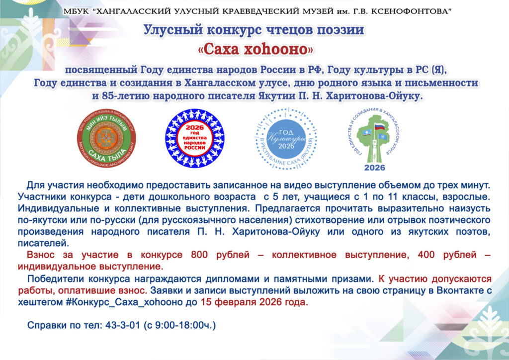 Для участия в акции необходимо записать видеоролик, на котором вы читаете любимое стихотворение или отрывок из произведений П. Н. Харитонова-Ойуку и выложить на свою страницу Вконтакте с хештегом #Читаем_Ойуку до 22 мая 2026 года.