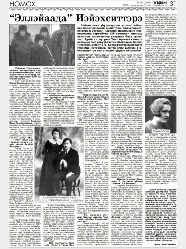 Г. В. Ксенофонтов туһунан “Кыым” хаһыакка 2023 с. кулун тутар ыйыгар тахсыбыт Нина Герасимова «Эллэйаада» Иэйэхситтэрэ» диэн ыстатыйатын билиһиннэрэбит. Быйыл саха уһулуччулаах уопсастыбаннай-бэлитиичэскэй диэйэтэлэ, фольклорист, этнограф-учуонай Гавриил Васильевич Ксенофонтов төрөөбүтэ 135 сылынан киниэхэ анаммыт тэрээһиннэр салҕанан бара тураллар. Аҕыйах хонугунан Тиит Арыыга киниэхэ анаммыт сыл үөрүүлээхтик аһылларын бэлиэтиэхтэрэ. Биһиги Г. В. Ксенофонтов сиэн балта Рейнида Петрованы кытта кини дьонун, Г. В. Ксенофонтов кэргэттэрин туһунан кэпсэтэбит.
