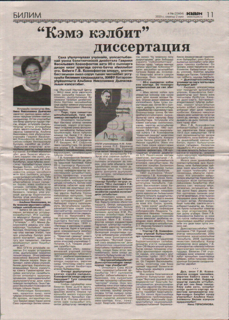 Г. В. Ксенофонтов туһунан “Кыым” хаһыакка 2023 с. олунньу ыйыгар тахсыбыт Нина Герасимова «Кэмэ кэлбит» диссертация» диэн ыстатыйатын билиһиннэрэбит.