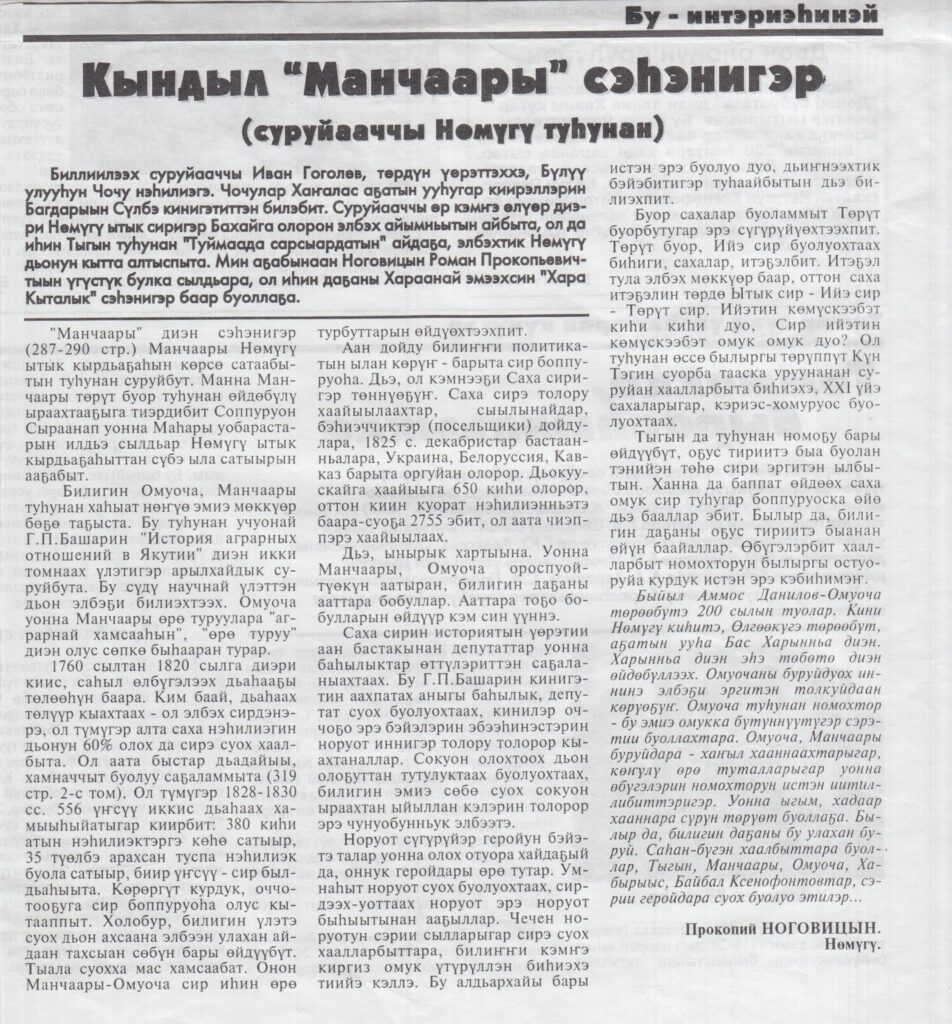 Хаҥалас хаһыат 2011 сыллаах таһаарыытыгар Прокопий Ноговицын Кындыл «Манчаары» сэһэнигэр (суруйааччы Нөмүгү туһунан) диэн ыстатыйатын билиһиннэрэбит.