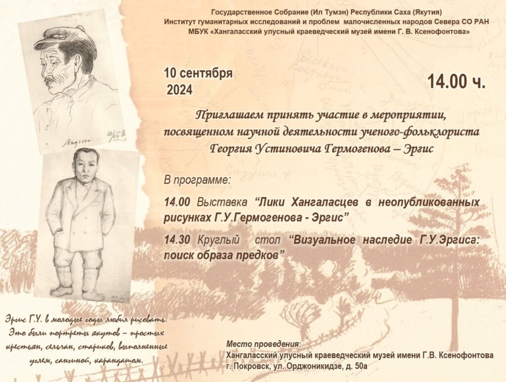10 сентября 2024 г. МБУК «Хангаласский улусный краеведческий музей им. Г. В. Ксенофонтова» совместно с Государственным собранием Ил Тумэн Республики Саха (Якутия) и Институтом гуманитарных исследований и проблем малочисленных народов Севера СО РАН организует работу круглого стола «Визуальное наследие Г.У. Эргиса: поиски образа предков» и открытие цифровой выставки «Лики хангаласцев». В молодые годы ученый- фольклорист Георгий Устинович Эргис любил рисовать и оставил после себя иконические образы определенных исторических местностей Хангаласского района и портретную серию своих земляков. Это были портреты якутов – простых крестьян, сельчан, стариков, выполненных углем, сангиной, карандашом, выполненных им в 1922-1949 гг. в наслегах Орджоникидзевского (Западно-Кангаласского) района ЯАССР. На выставке будут показаны 46 цифровых копий графических произведений Георгия Устиновича, представленные Институтом гуманитарных исследований и проблем малочисленных народов Севера СО РАН.
