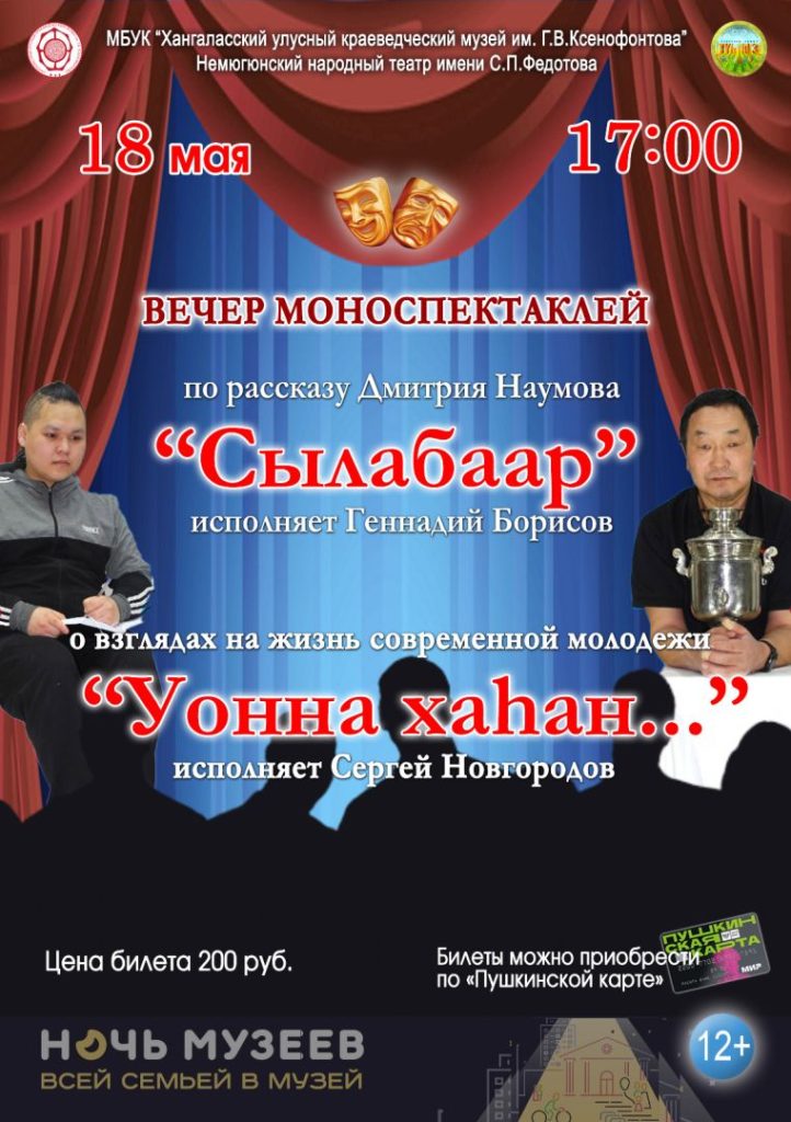 Приглашаем на вечер моноспектаклей Немюгюнского народного театра им. С. П. Федотова «Сылабаар», «Уонна хаһан…»