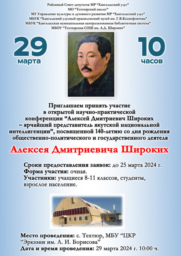 Приглашаем принять участие в открытой научно-практической конференции «Алексей Дмитриевич Широких – ярчайший представитель якутской национальной интеллигенции», посвященной 140-летию со дня рождения общественно-политического и государственного деятеля Алексея Дмитриевича Широких.