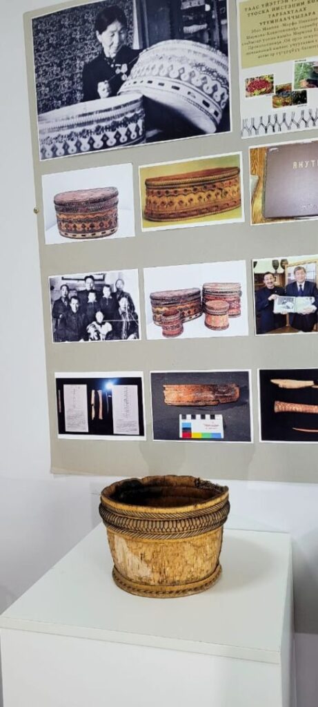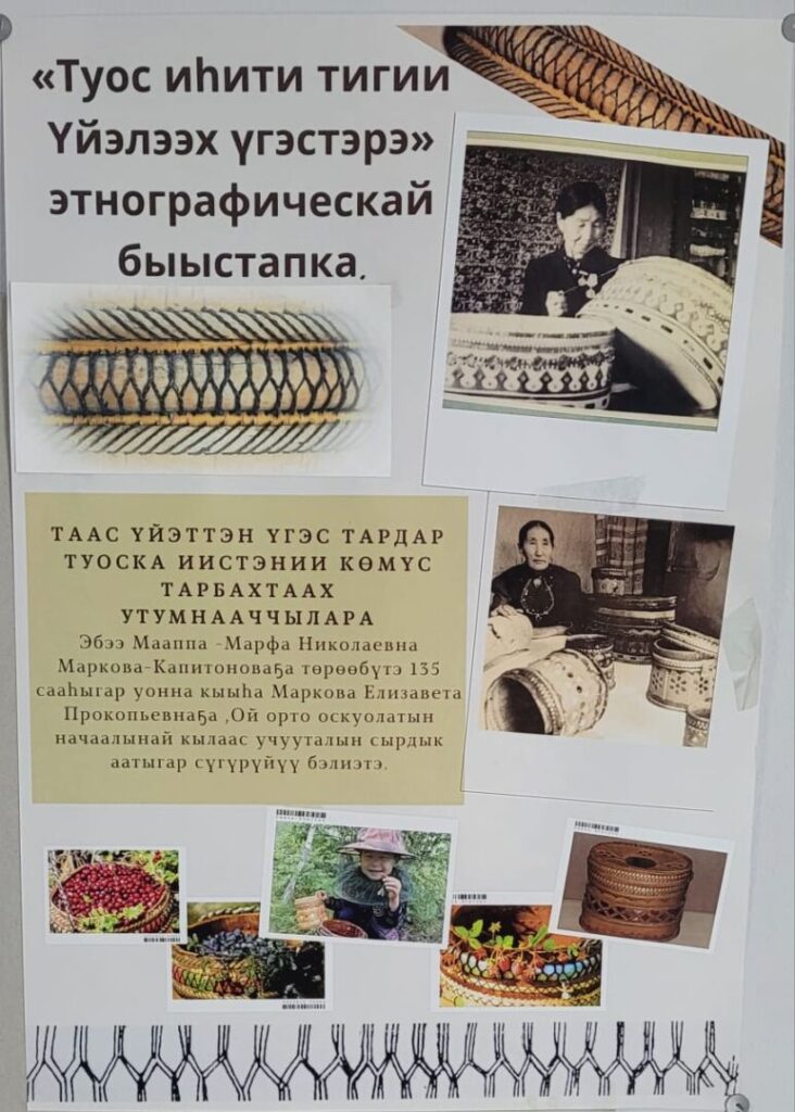 На выставке были представлены экспонаты из фонда Хангаласского улусного краеведческого музея им. Г. В. Ксенофонтова – береста из места захоронения Мазары Бозекова, подъемные материалы с долины Эркээни экспедиции школьников «Эллэйада» под руководством Прокопия Романовича Ноговицына, выставка рисунков-свитков участников объединения «Дьэр кустуга» (руководитель – Григорьева Марфа Дмитриевна), экспонаты раскопок 2023 года, проведенные работниками Института гуманитарных исследований и проблем малочисленных народов Севера СО РАН и волонтерами под руководством Прокопьевой А. Н.