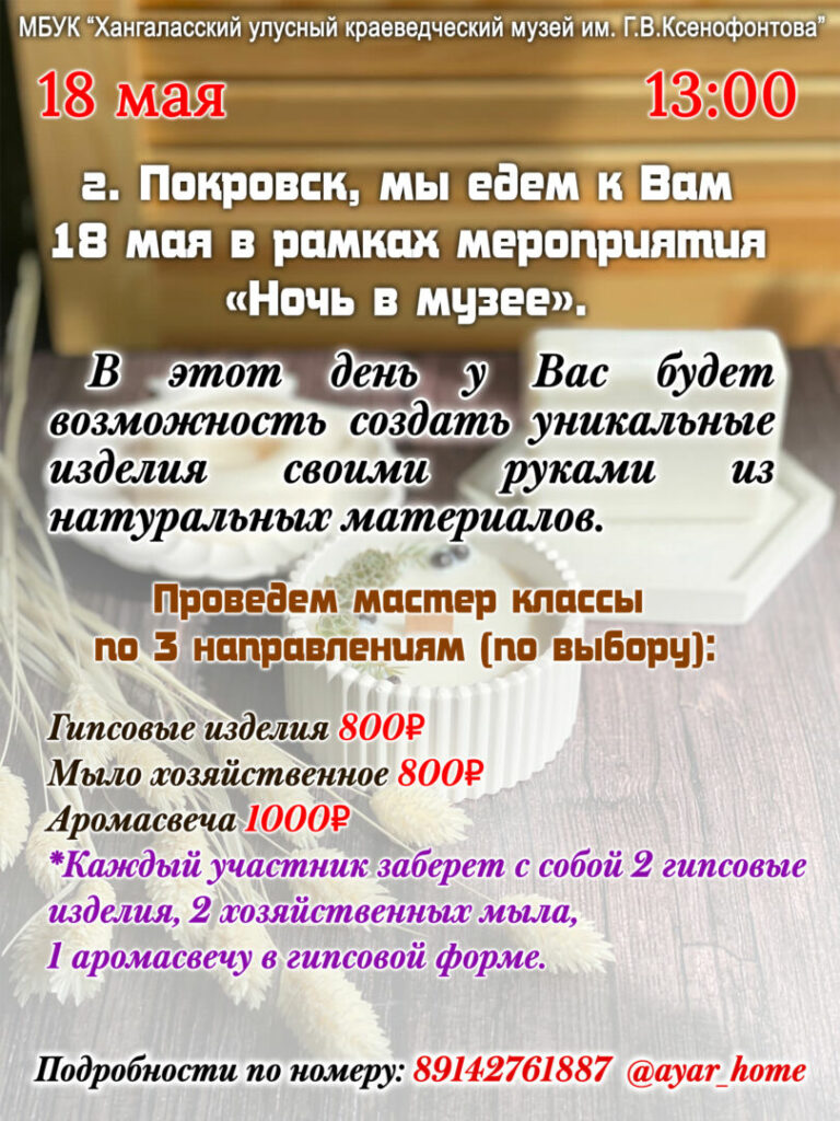 18 мая в рамках мероприятия «Ночь в музее» прошла мастер-класс по изготовлению гипсовых изделий, мыла и аромасвечи.