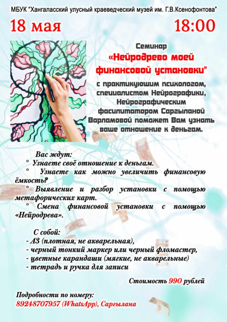 Прошел семинар «Нейродрево моей финансовой установки» с практикующим психологом, специалистом Нейрографики, Нейрографическим фасилитатором Саргыланой Варламовой.