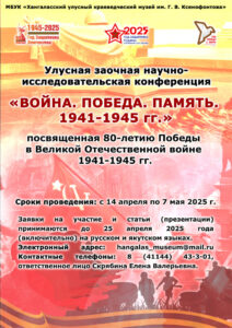Сегодня в музее состоялось торжественное награждение участников улусной заочной научно-исследовательской конференции «ВОЙНА. ПОБЕДА. ПАМЯТЬ 1941-1945 гг.», посвященной 80-летию Победы в Великой Отечественной войне 1941-1945 гг.