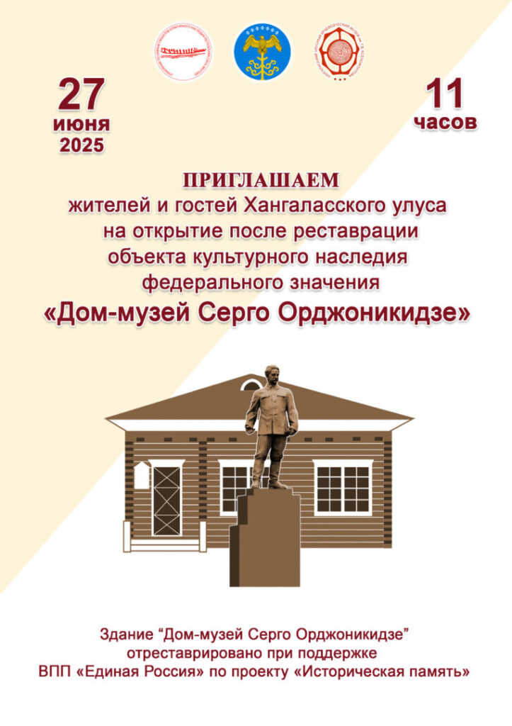 Приглашаем жителей и гостей Хангаласского улуса на открытие после реставрации объекта культурного наследия федерального значения «Дом-музей Серго Орджоникидзе» 27 июня с 11 часов.