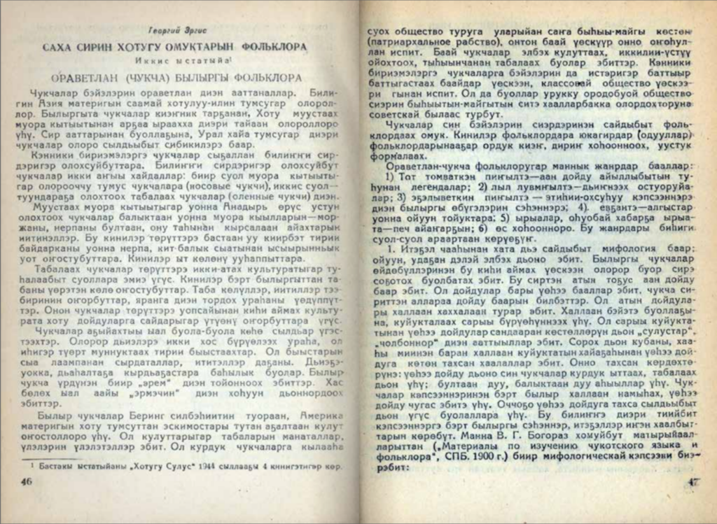 «Хотугу сулус» сурунаал 1946 с. таһаарыытыгар Георгий Эргис «Саха сирин хотугу омуктарын фольклордара» диэн ыстатыйатын иккис чааһын билиһиннэрэбит.
