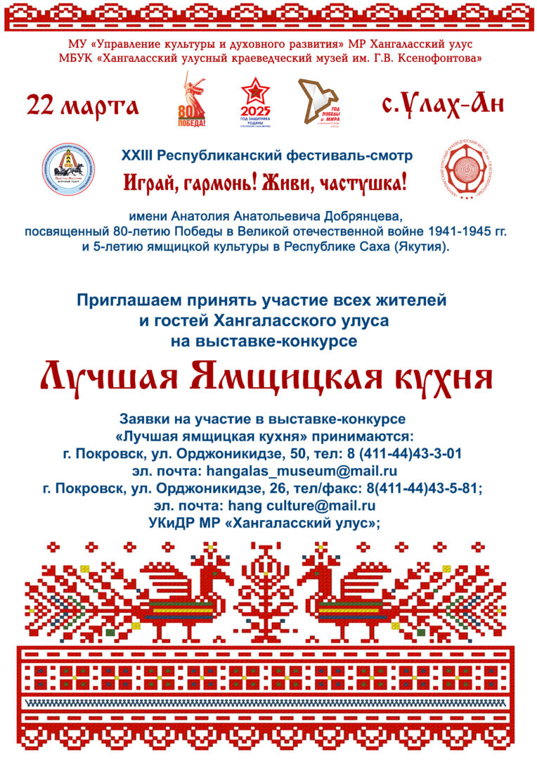 Заявки принимаются: hang_culture@mail.ru 43-5-81, hangalas_museum@mail.ru 43-3-01