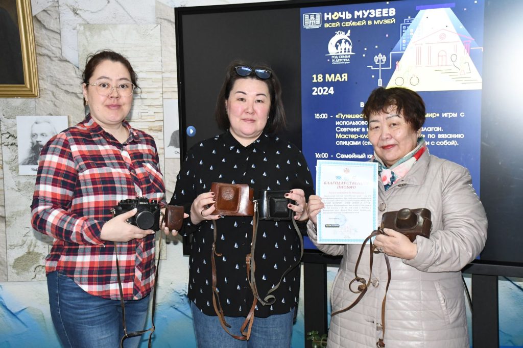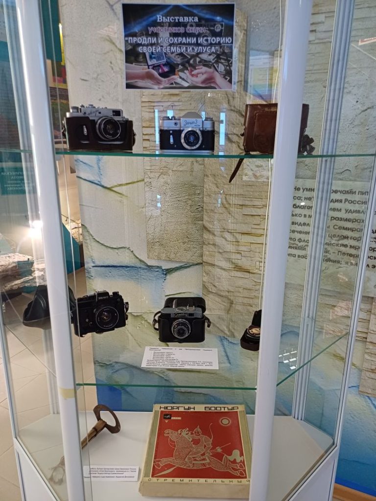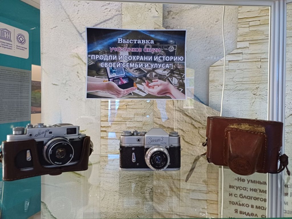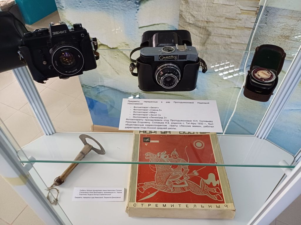 В рамках акции «Продли и сохрани историю своей семьи и улуса» фонд музея пополнился 7 предметами, подаренными Протодьяконовой Надеждой Николаевной (коллекция советских фотоаппаратов) и Аммосовой Людмилой Денисовной (пластинка олонхо «Нюргун Боотур Стремительный», скобель).